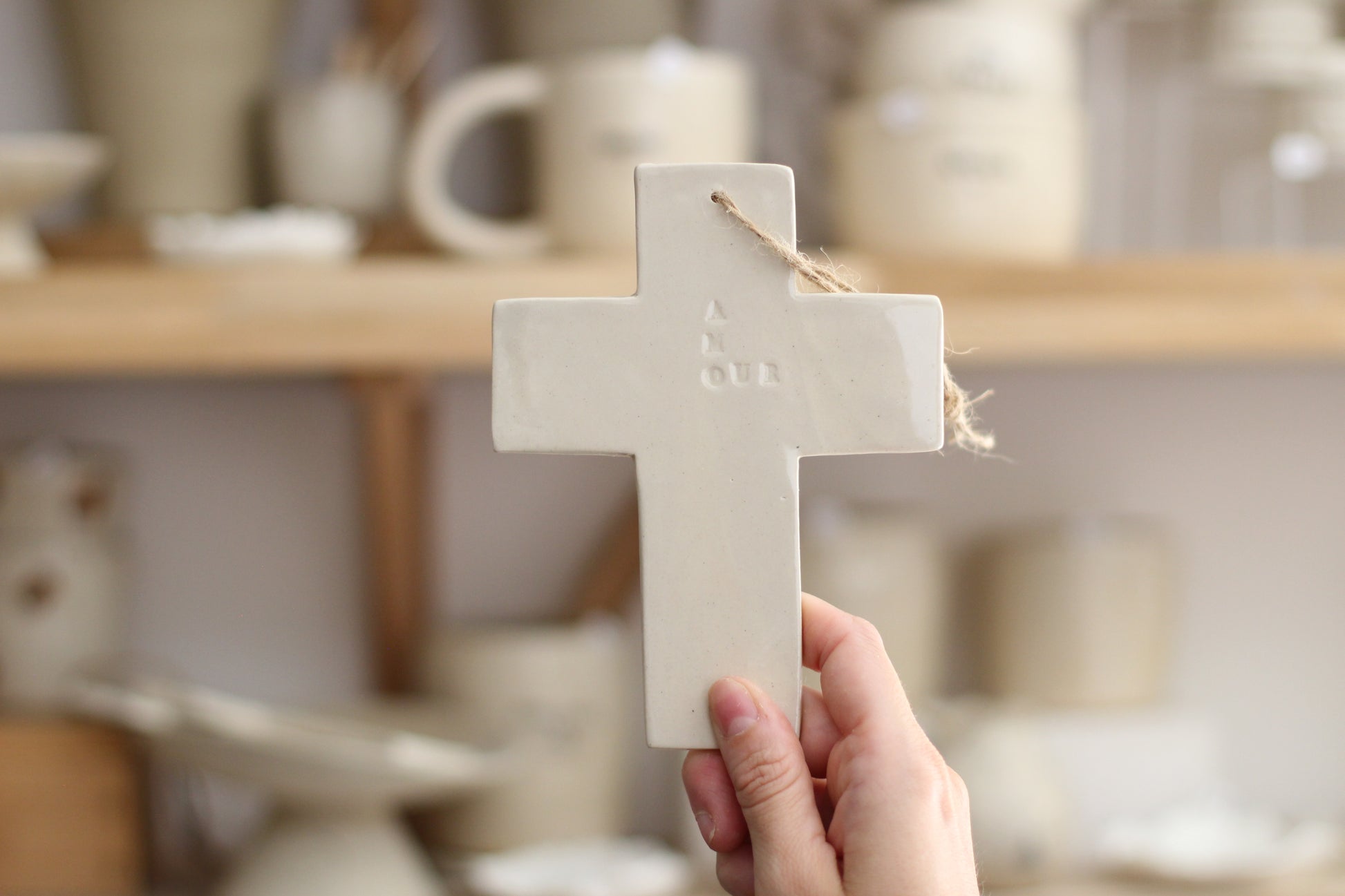 Croix décorative en céramique blanche émaillée, réalisée entièrement à la main. Une pièce unique aux lignes droites, à la fois symbolique et délicatement décorative.