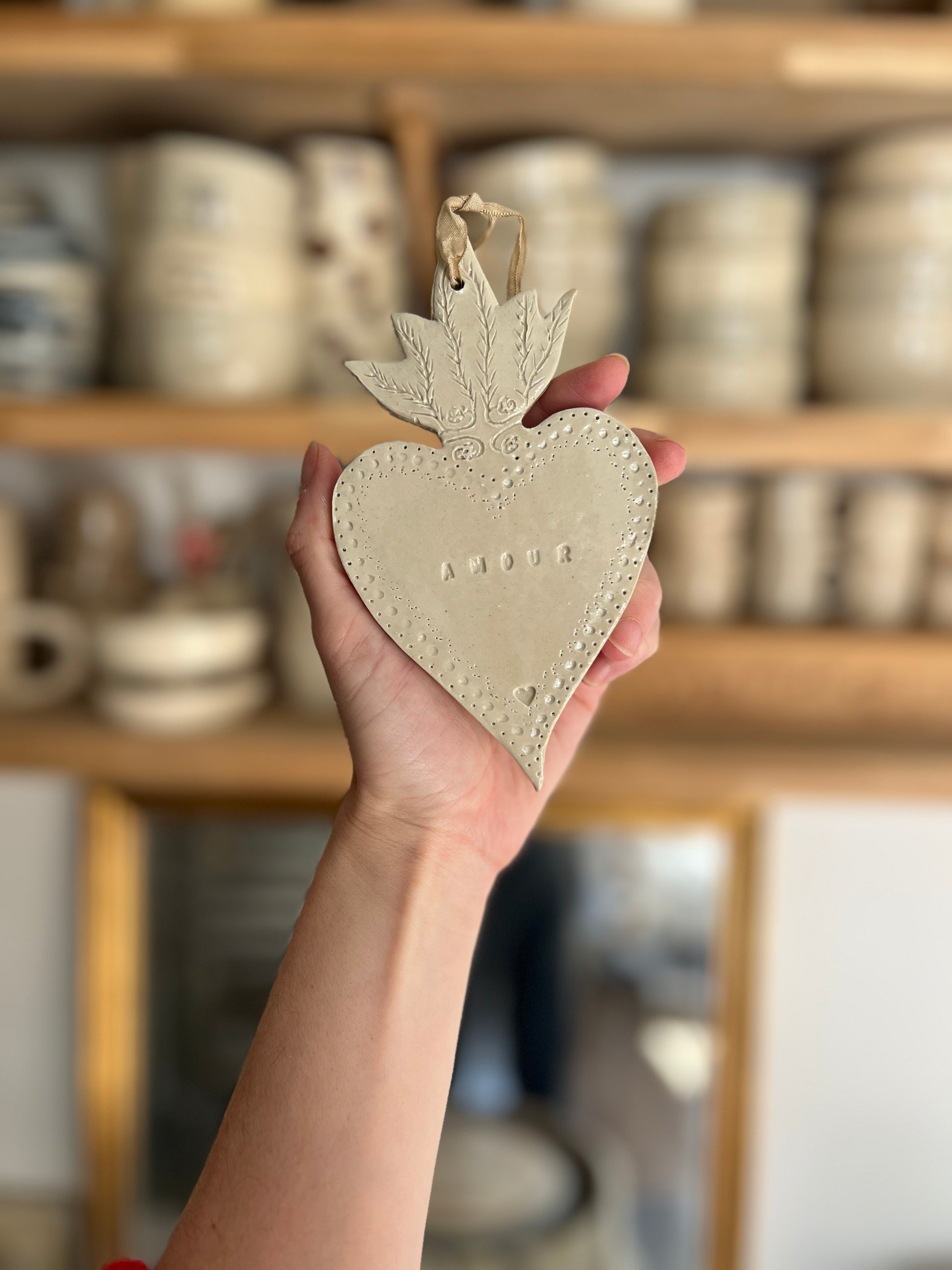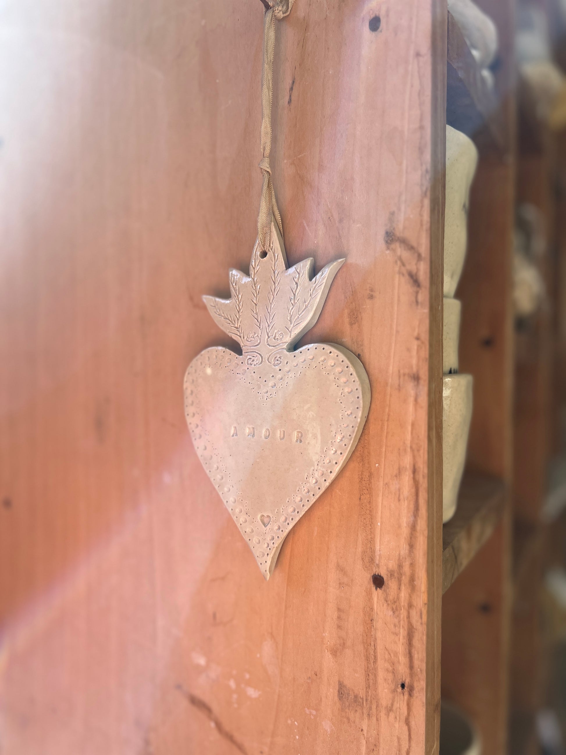 Coeur ex voto en grès blanc émaillé, pièce unique entièrement réalisée à la main. A la fois symbolique et décorative.