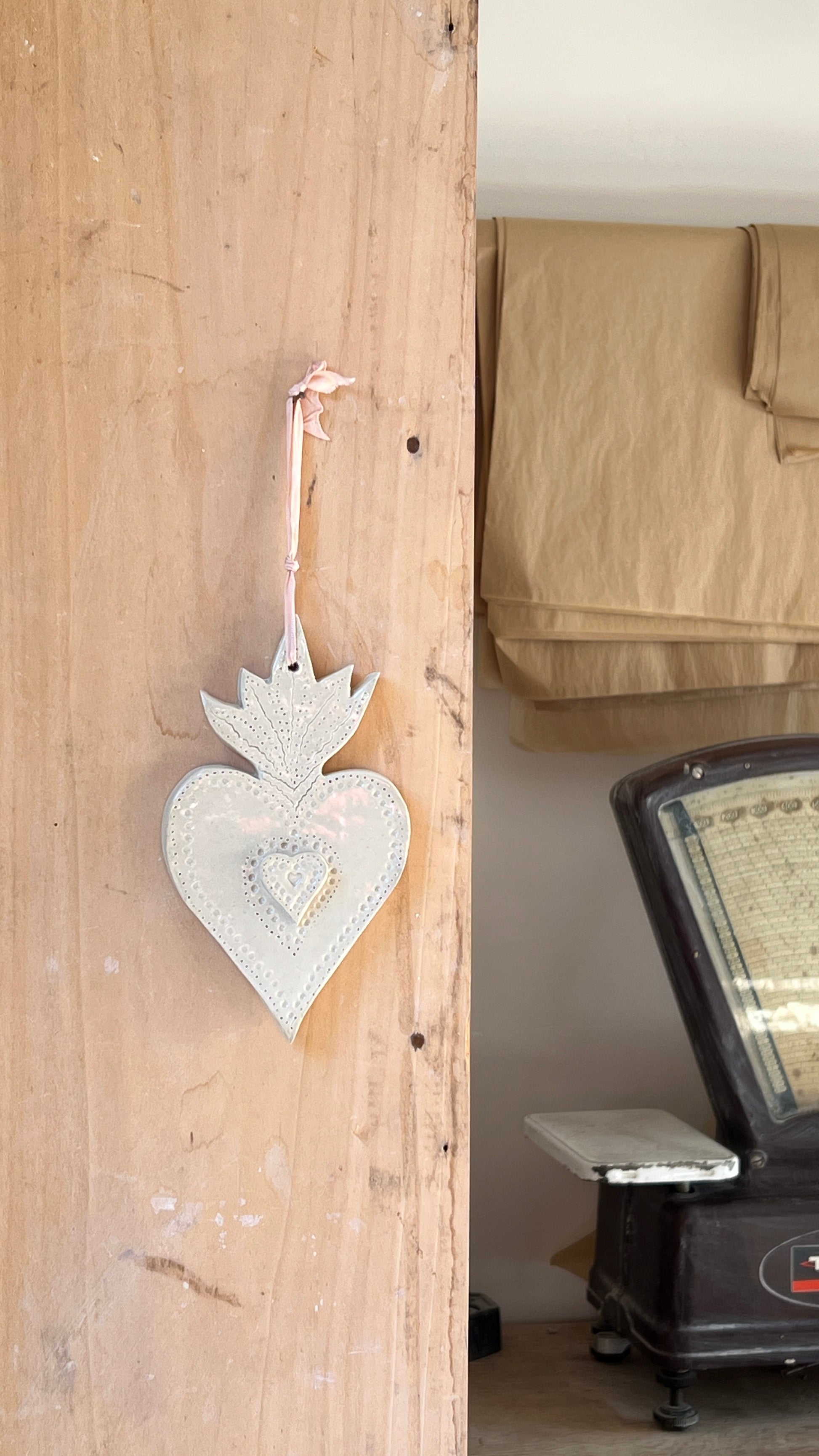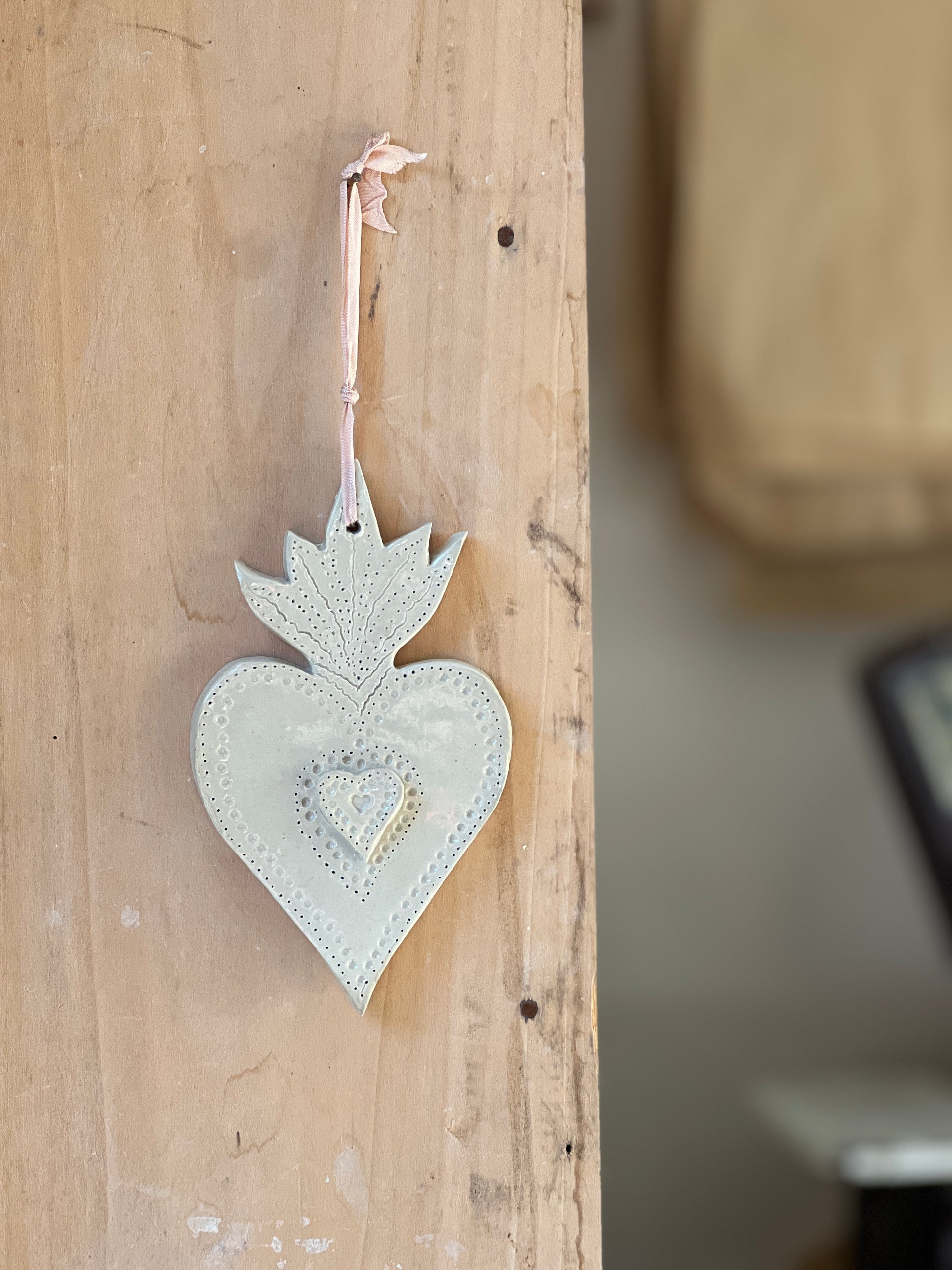 Coeur ex voto en grès blanc émaillé, pièce unique entièrement réalisée à la main. A la fois symbolique et décorative.