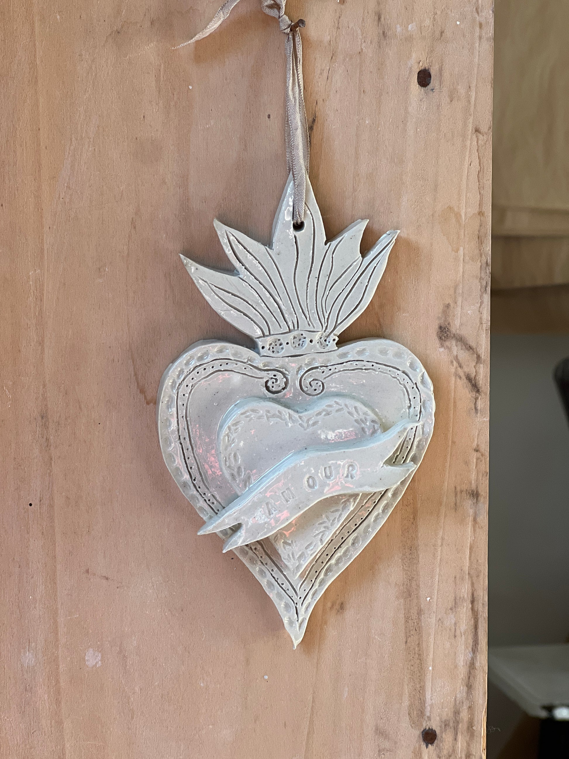 Coeur ex voto en grès blanc émaillé, pièce unique entièrement réalisée à la main. A la fois symbolique et décorative.