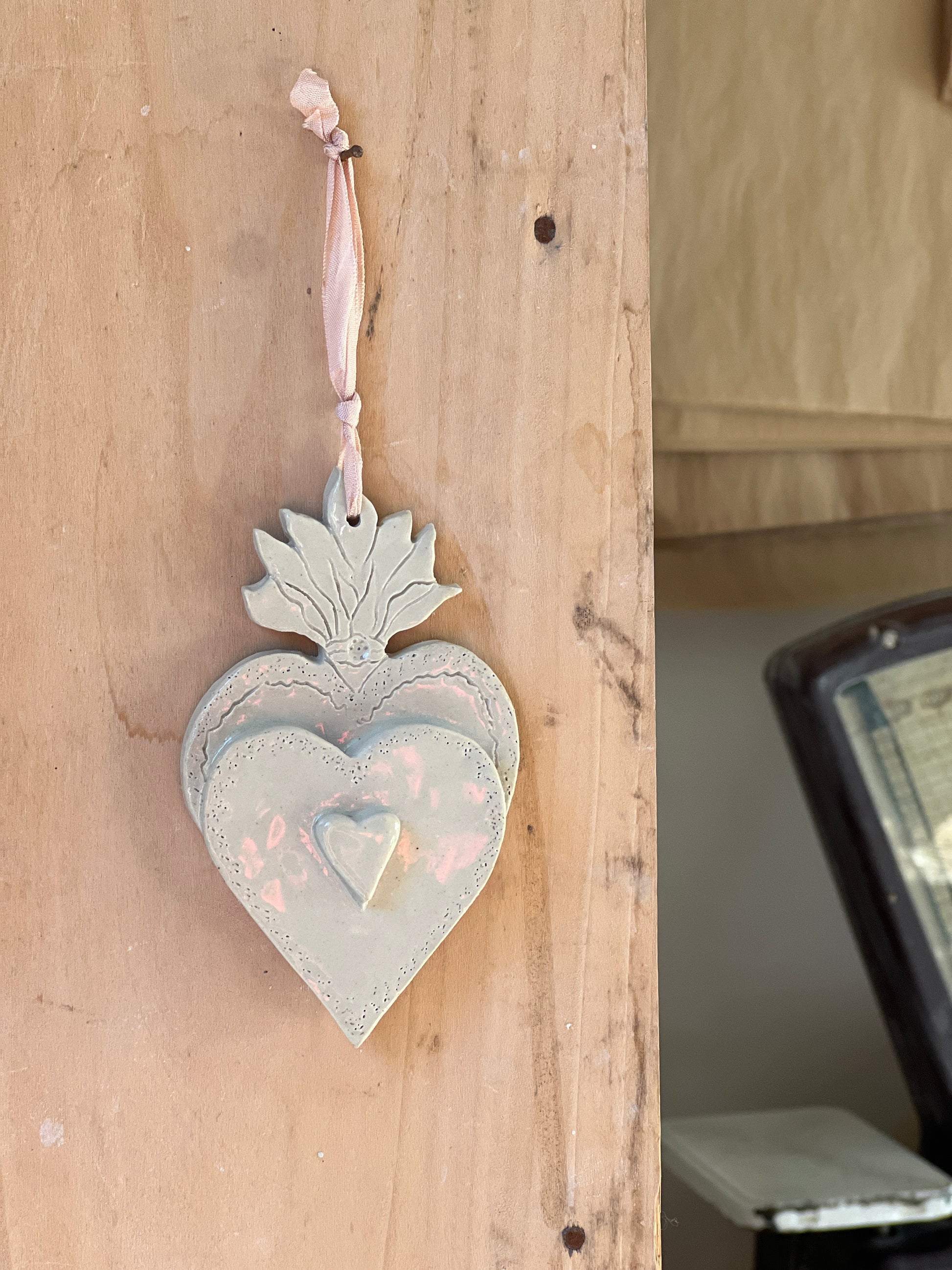Coeur ex voto en grès blanc émaillé, pièce unique entièrement réalisée à la main. A la fois symbolique et décorative.