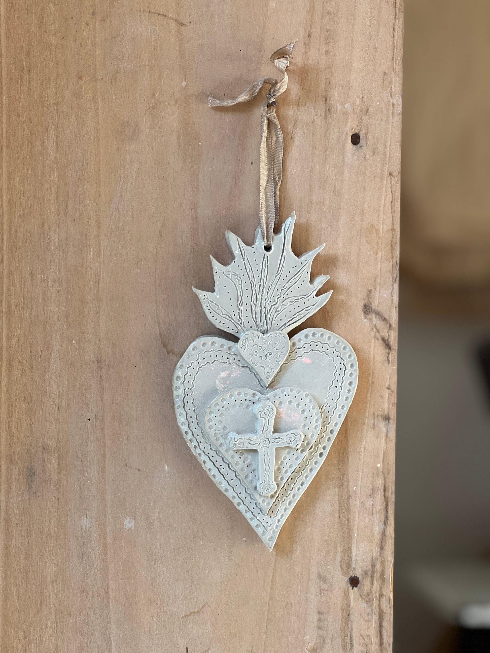 Coeur ex voto en grès blanc émaillé, pièce unique entièrement réalisée à la main. A la fois symbolique et décorative.