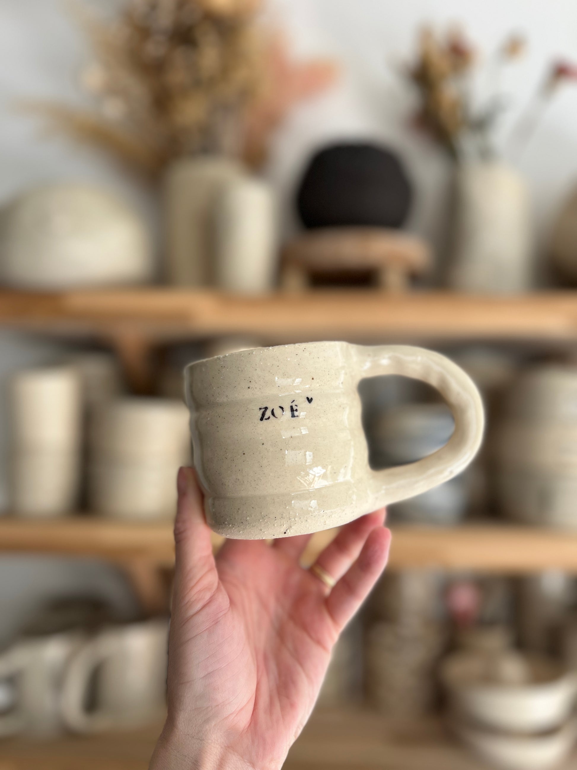 Mug en grès recyclé entièrement tourné à la main avec l'inscription de votre choix.