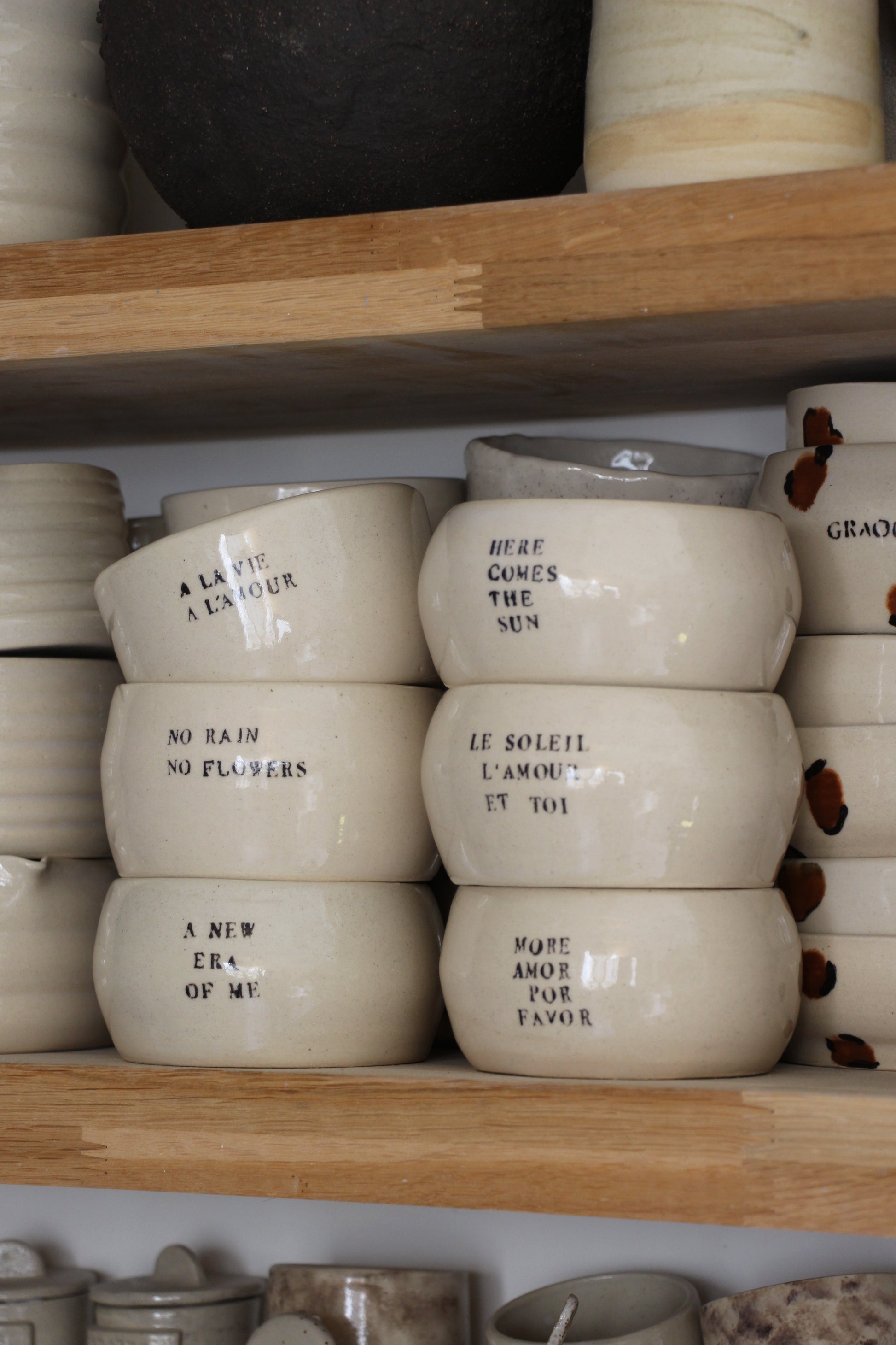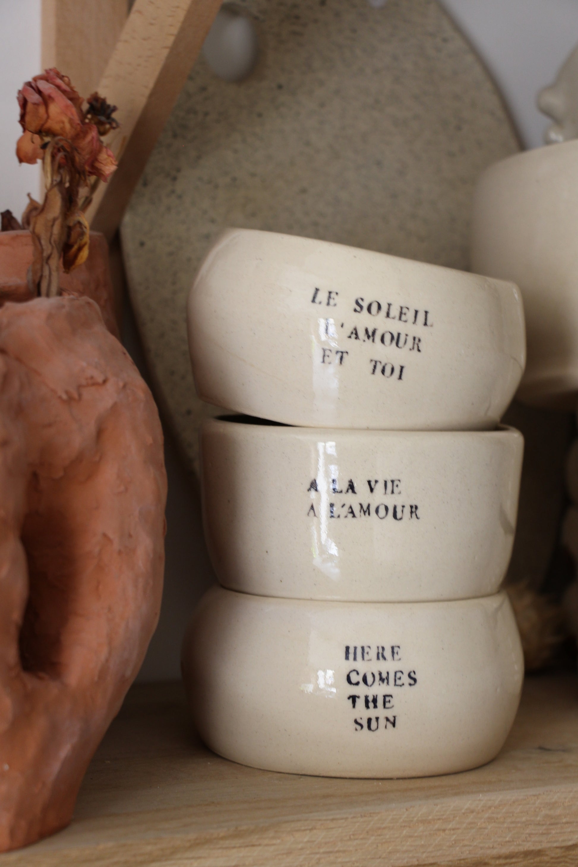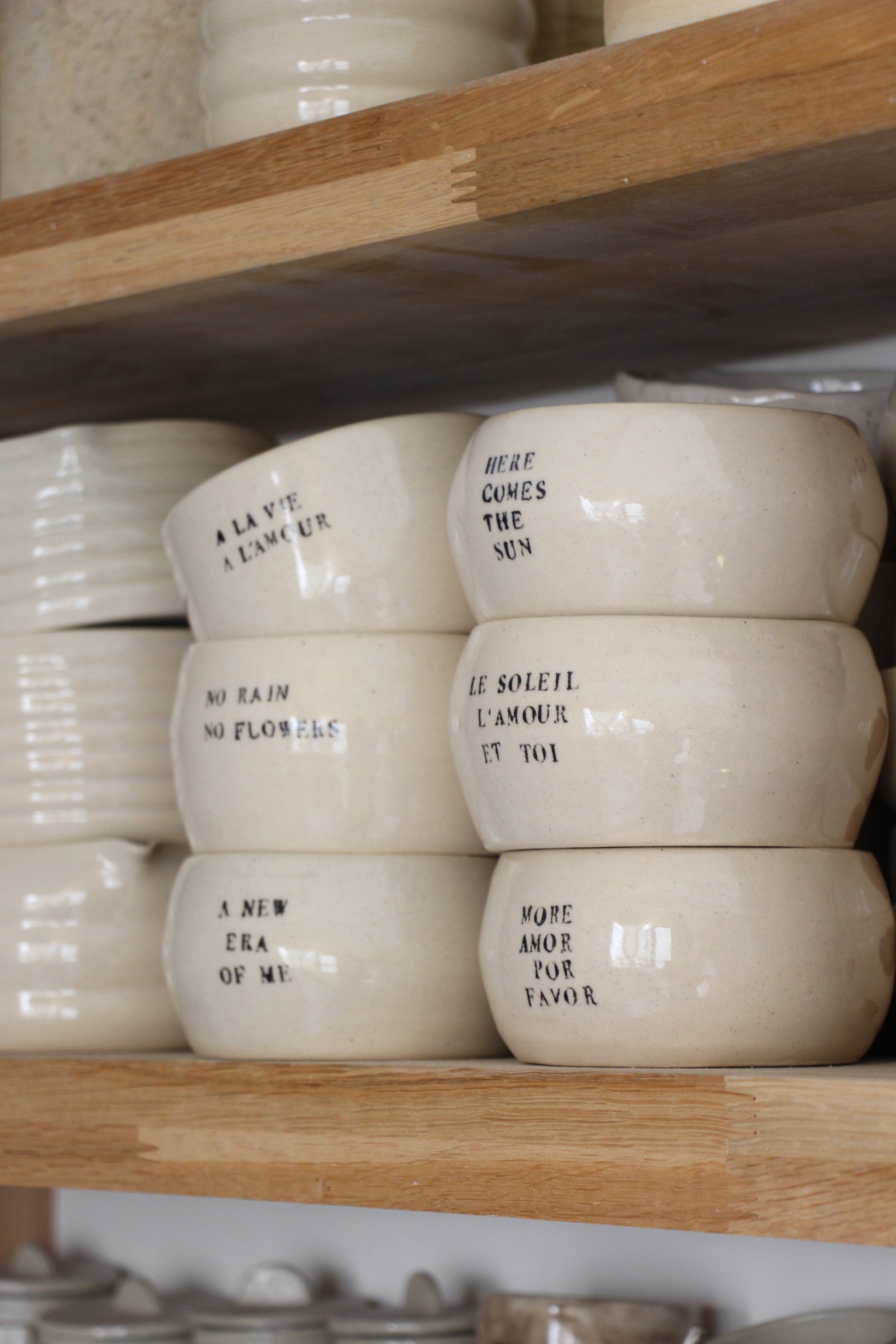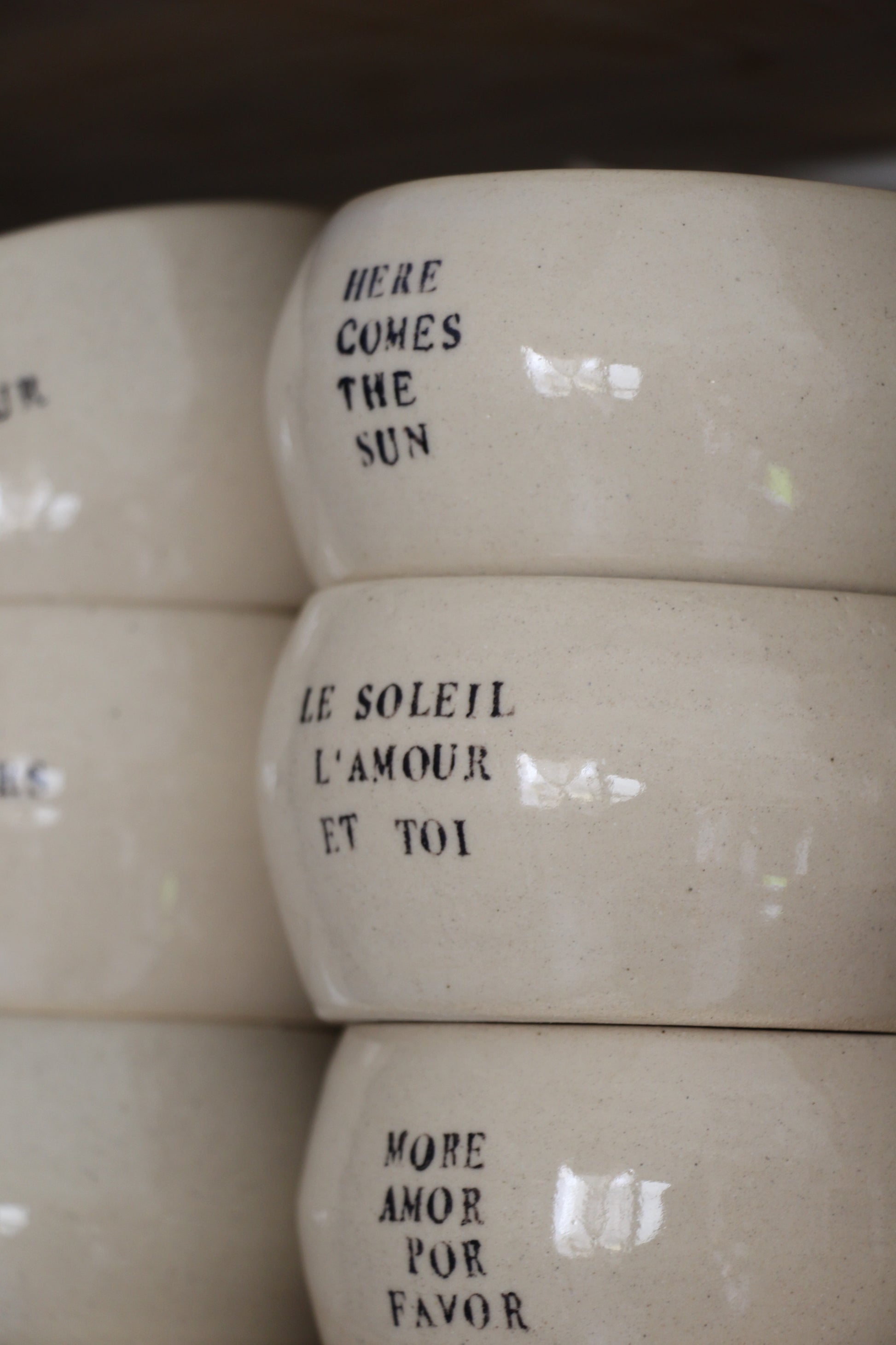 Bol en grès recyclé entièrement tourné à la main, inscription tamponnée lettre par lettre.