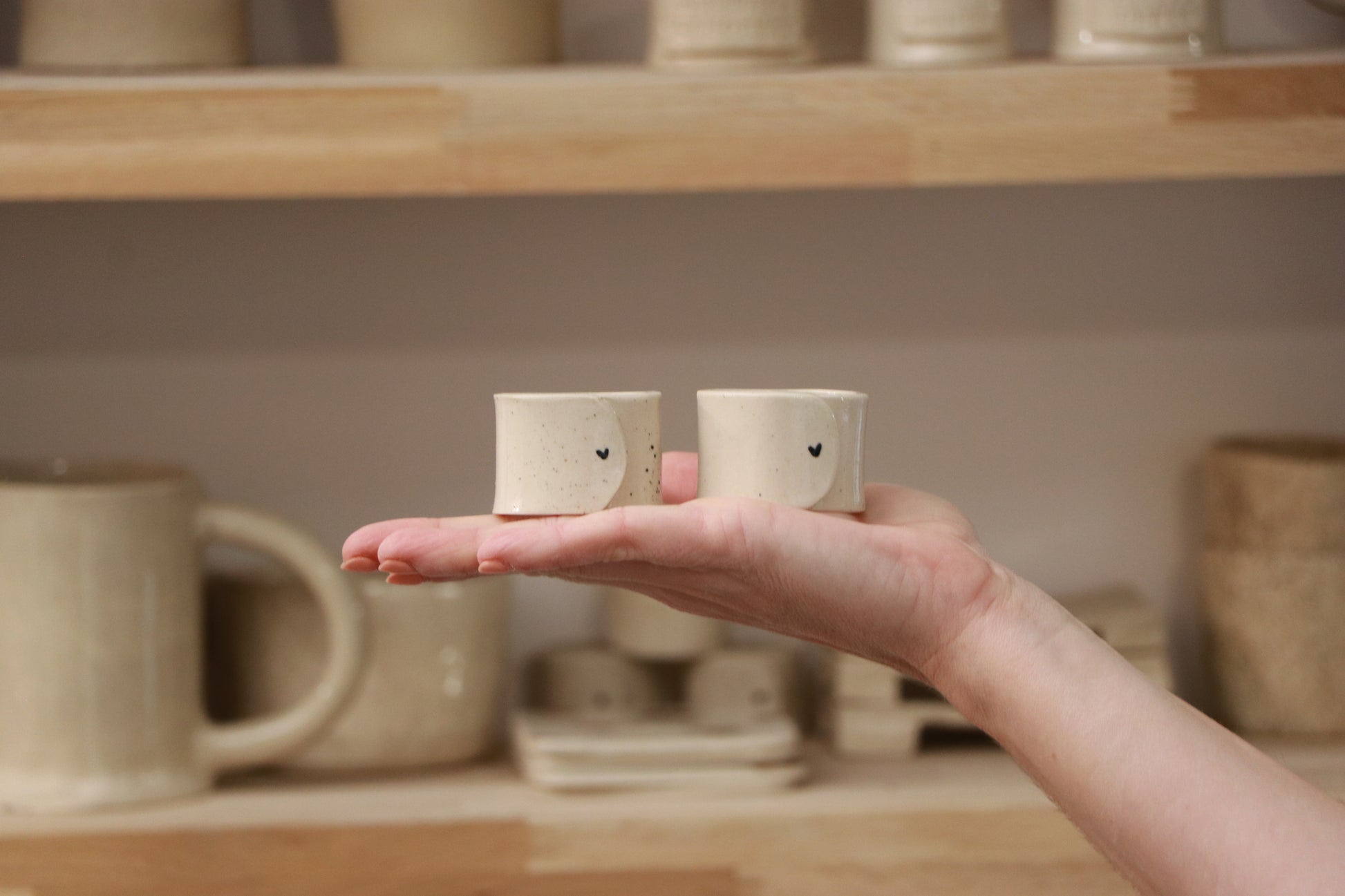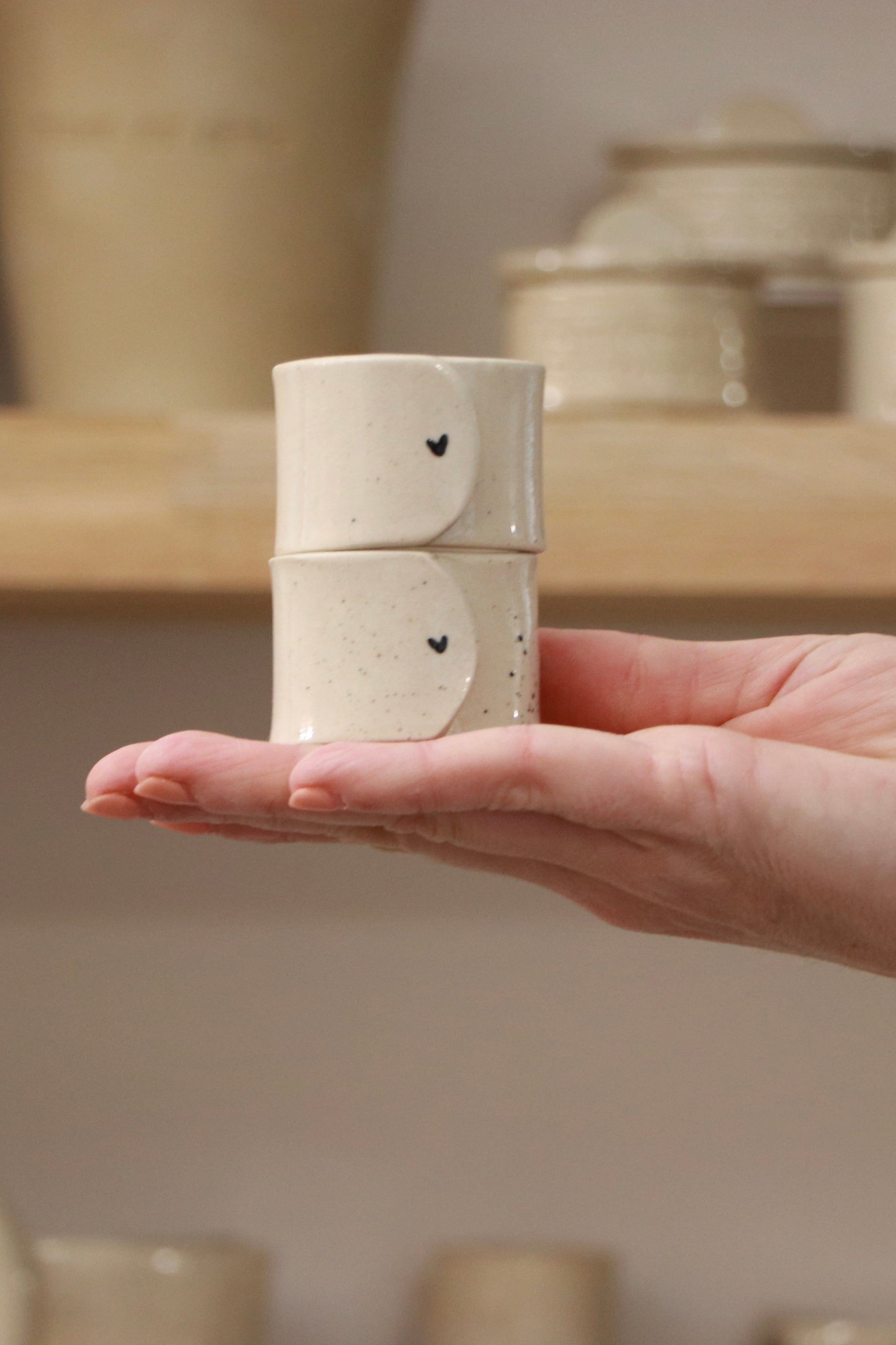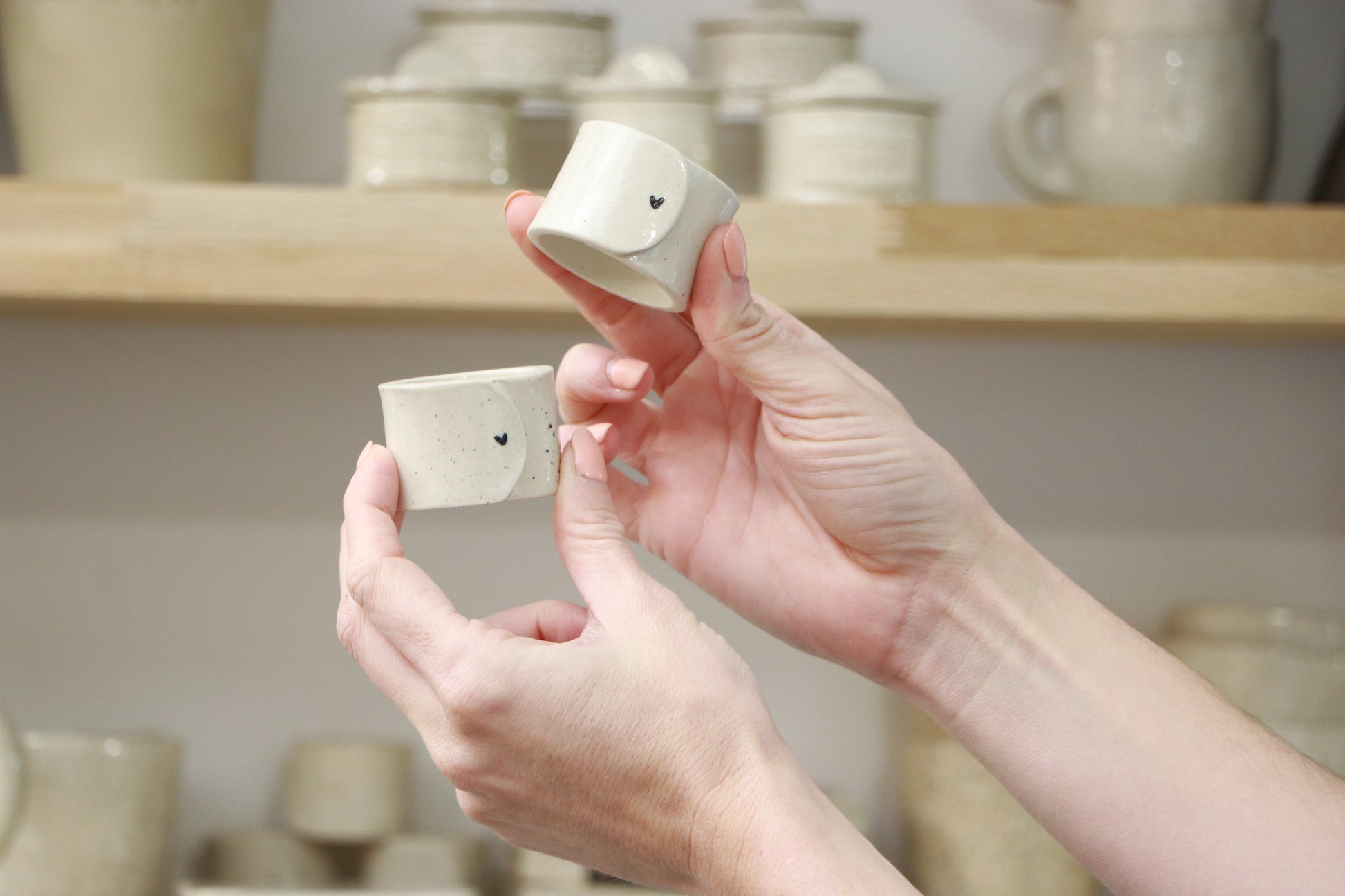 Ronds de serviettes en grès blanc émaillé moucheté, avec petit coeur. Vendus par lot de 2.